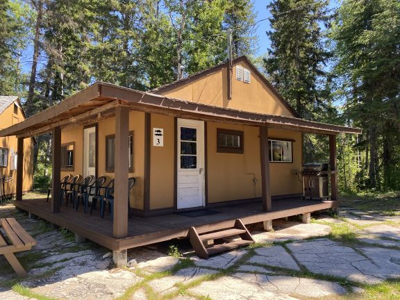 This spacious cabin has two bedrooms with 2 single bunkbeds & a double/single bunkbed in each. This cabin has an oven, 3 piece washroom & is located across from the lodge, with a lakeview deck to sit & relax on. (can sleep 10 total)
