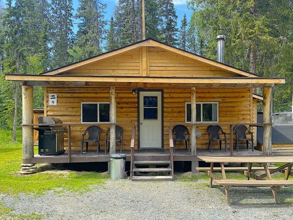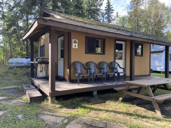 This newer cabin has two bedrooms - one with a double/single bunkbed and a single bed & one with 4 single bunkbeds. It is located across from the lodge, with a deck to sit & relax on. There is a shower/washroom building next to the cabin. (can sleep 8 total)